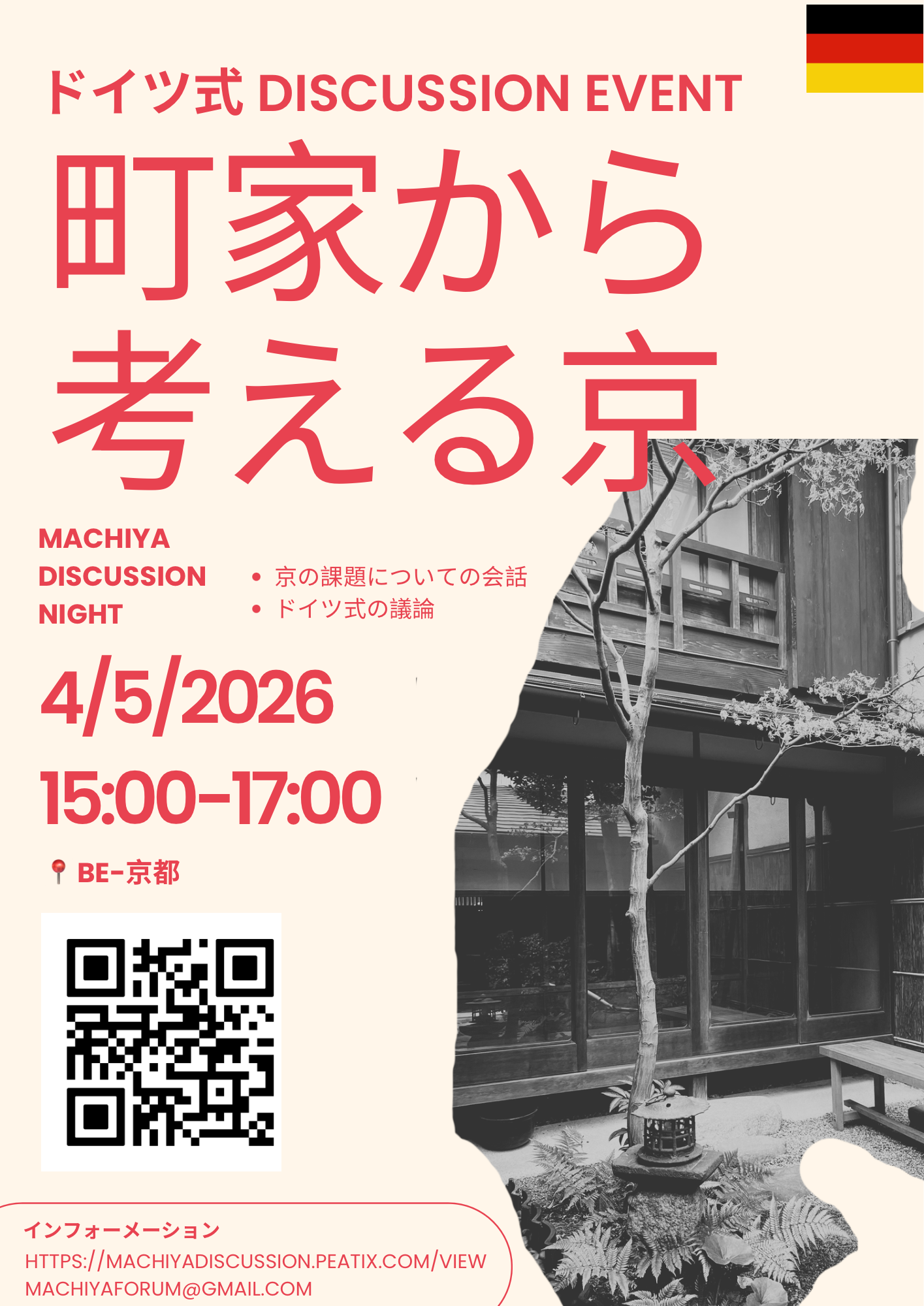 本イベントは、ドイツにルーツを持ち、日本の背景も併せ持つ主催者によって企画されたディスカッションイベントです。ドイツの議論文化に着想を得た対話のスタイルを、京都の空間に取り入れることを目的としています。会場は伝統的な町家であり、落ち着いた雰囲気の中で、京都での暮らしや現代社会の課題について丁寧に考える時間を提供します。本イベントでは、構造的で思慮深い対話を重視し、互いの意見に耳を傾けながら理解を深めていくことを大切にしています。参加者は少人数のグループに分かれ、京都の変化や地域社会、現代の課題について意見を交わします。議論の勝ち負けではなく、多様な視点に触れることで新たな気づきを得ることを目指しています。なお、本イベントの収益はすべて Food Bank Kyoto に寄付され、地域社会への貢献につなげられます。ドイツの対話文化と町家という伝統的な空間を結びつけることで、思考と交流、そして社会への関心を深める場を創出することを目指しています。?スケジュール:15:00〜 ウェルカム/アライバル15:15〜 イントロダクション15:25〜 ハードコアディスカッション!16:30〜 オープンネットワーク/おつまみ?京都に長くお住まいの方、そして京都へ引越して来られた方のご参加をお待ちしております。?キャンセルポリシー:開催3日前までのキャンセルは全額返金いたします。前日・前々日のキャンセルは50%返金となります。当日のキャンセルは返金いたしかねますのでご了承ください。なお、参加権は他の方へ譲渡可能です。